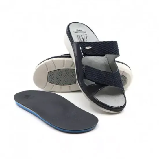 Batz Sorrento női papucs sötétkék színben. Szereted a kék színt, akkor ez a Te papucsod lesz. Gyönyörű sötétkék szín, ahol a lakkbőr és a mintás felsőrész találkozik, ezzel megkoronázva a lábbelit. Már emiatt is egyedi, a pont az i-re viszont, hogy cserélhető, kivehető talpbetétes modell, mely a korszerű elvárásokhoz igazodik, de ha igazán luxusra vágysz egyedi talpbetét is készíttethető hozzá. melybe akár egyedi talpbetétet is helyezhetsz. Miért jó az egyedi talpbetét? Egyik nagy előnye az egyedi talpbetétnek, hogy személyre szabottan, megfelelő ívben támasztja alá a hossz- és harántboltozatot, ezáltal csökkentve a lábat érő terhelést. Higiénikus megoldás, gyors, egyszerű csere. Anatómiai kialakítás gondoskodik lábaid egésznapos jóllétéről, és állítható tépőzáras pánt segít abban, hogy teljesen saját igényeidre szabhasd a papucsot. Finom, nőies, amely magas minőségű bőrből készült . Szuper kényelmes és igazán nőies darab. Élvezd a hosszú sétákat, bújj bele te is, és próbáld ki!