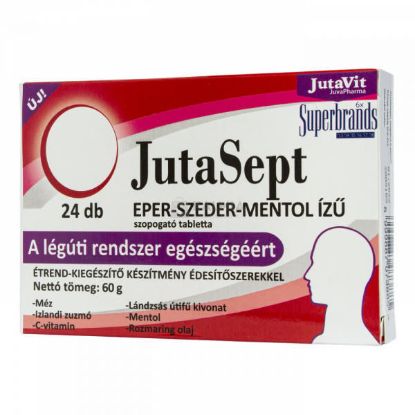 JutaVit JutaSept eper-szeder-mentol ízű szopogató pasztilla. A lándzsás útifű és izlandi zuzmó hozzájárul a torok és a garat egészségének megőrzéséhez, az immunrendszer megfelelő működésének támogatásához. A C-vitamin segít az immunrendszer erősítésében.